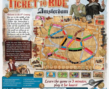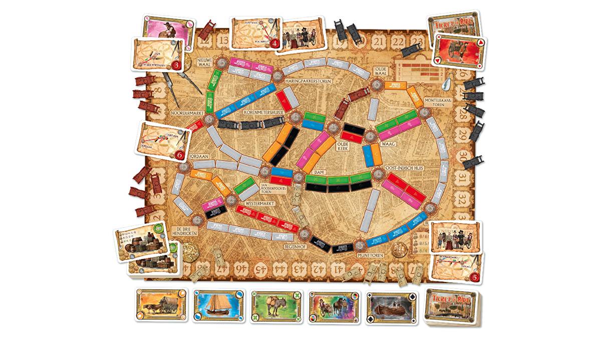 Ticket to Ride: Amsterdam features the familiar gameplay from the Ticket to Ride game series — collect cards, claim routes, draw tickets — but on a map of 17th century Amsterdam that allows you to complete a game in no more than 15 minutes.