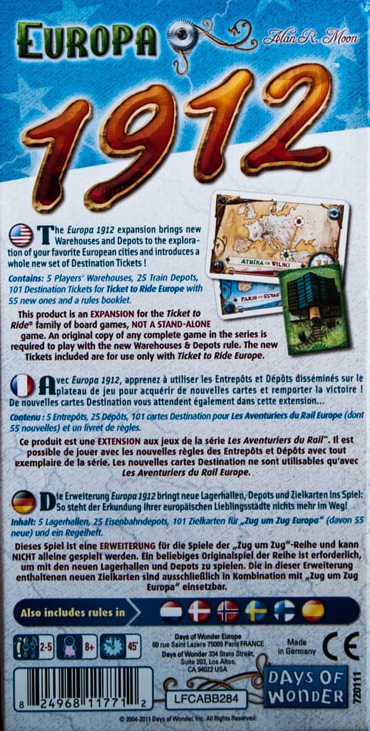 The Ticket to Ride Europa 1912 expansion for the Ticket to Ride series includes 101 Destination Tickets - the 46 original tickets, plus 55 new ones that enable 3 new variants to the Ticket to Ride Europe map: Europe Expanded, which adds 19 new routes to the original 46; Big Cities of Europe, with tickets to 9 major European cities; and Mega Europe, which uses all the new routes as well as the 46 original Destination Tickets.