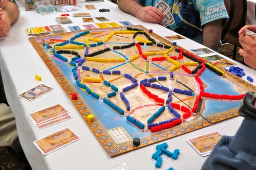 This expansion introduces 45 new terrain cards, divided into three different terrain types. Each type is associated with different route colors: Desert/Savanna cards for yellow, orange and red routes; Jungle/Forest cards for green, blue and purple routes; and Mountain/Cliff cards for black, white and grey routes. Players can draw terrain cards just like train cards and they may use these to double the value of the routes they claim, under certain conditions.