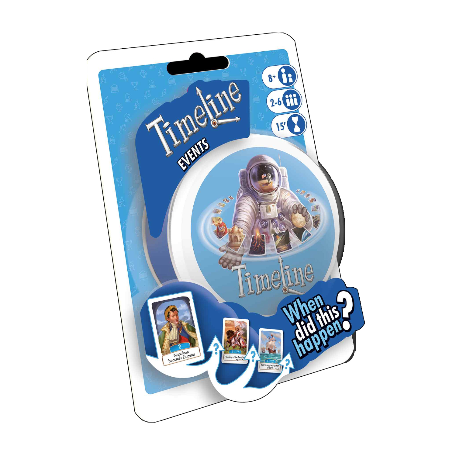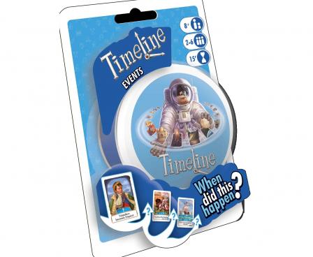Timeline: Events is a card game played using 55 cards. Each card depicts a historical event on both sides, with the year in which that event occurred on only one side. Players take turns placing a card from their hand in a row on the table. After placing the card, the player reveals the date on it. If the card was placed correctly with the date in chronological order with all other cards on the table, the card stays in place; otherwise the card is removed from play and the player takes another card from the deck.