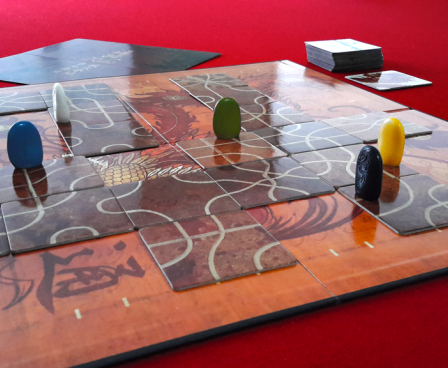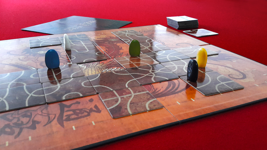 The game consists of tiles with twisting lines on them, a 6x6 grid on which to lay these tiles and a token for each player. Each player has a hand of tiles. On your turn you do two things: place a tile from your hand onto the board next to your token and move your token as far as it can go along the line it is currently on, until it is stopped by an empty space with no tile in (yet), the edge of the board or colliding with another player's token. If your token reaches the edge of the board or collides with another player's token, you are out of the game. The aim of the game is to be the last player left with a token on the board. Strategy therefore consists of trying to drive your opponents either into each other or off the board whilst extending your own route in directions that will make it difficult for your opponents to do the same.