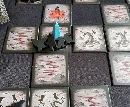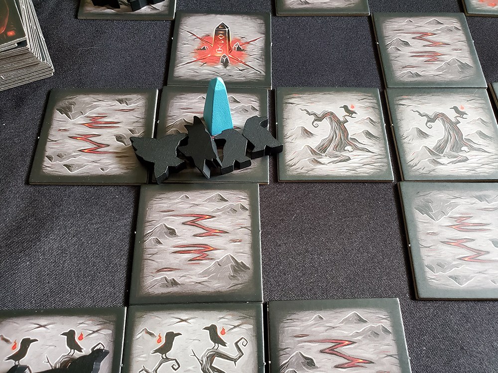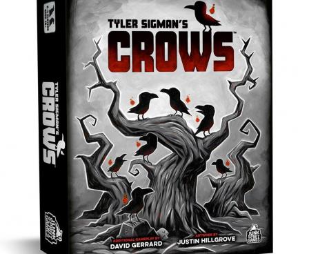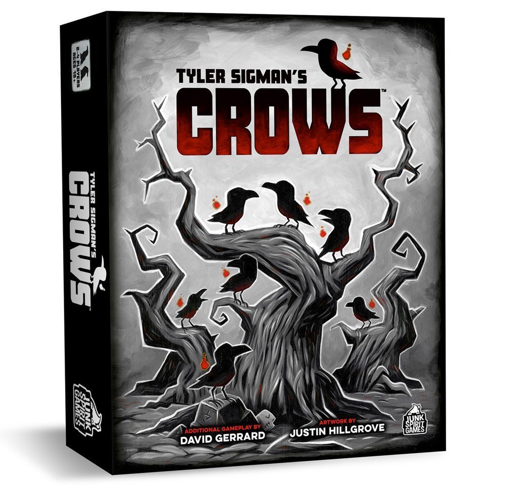 Tyler Sigman's Crows is a competitive tile placement game where every player takes on the role of an Outcast Mage in the world of Tessandor. A once-in-a-lifetime event is causing the crows of the Obsidian Wastes to give off mana that can be collected in magical stones. Players score points by enticing crows to flock to their totem (their shiny object). This can potentially create murders of crows, which then disperse throughout the ever changing map keeping the strategic gameplay tense and diverse.