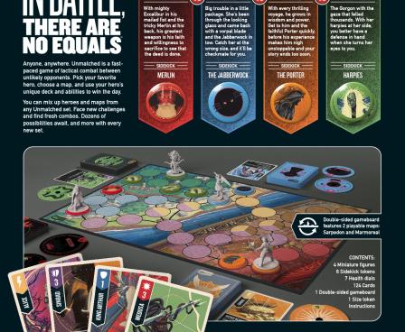 Unmatched is a highly asymmetrical miniature fighting game for two or four players. Each hero is represented by a unique deck designed to evoke their style and legend. Tactical movement and no-luck combat resolution create a unique play experience that rewards expertise, but just when you've mastered one set, new heroes arrive to provide all new match-ups.