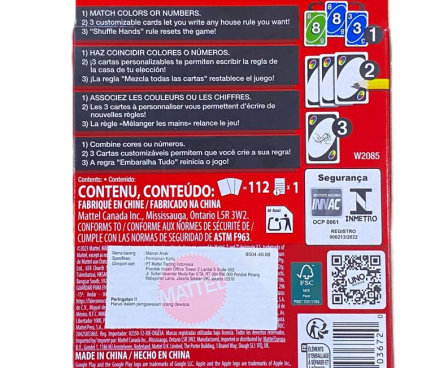 UNO is the classic card game that’s easy to pick up and impossible to put down! Players take turns matching a card in their hand with the current card shown on top of the deck either by color or number. Special action cards deliver game-changing moments as they help you defeat your opponents. These include Skips, Reverses, Draw Twos, Wild and Draw Four Wild cards. You’ll find 25 of each color (red, green, blue, and yellow), eight Wild cards, three Customizable cards and one Special Rule card inside the 112-card deck. If you can’t make a match, you must draw from the central pile! And when you’re down to one card, don’t forget to shout “UNO!” The first player to rid themselves of all the cards in their hand before their opponents wins. It’s Fast Fun for Everyone!