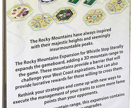 The Rocky Mountains Expansion literally expands the Whistle Stop gameboard, adding a 3D mountain range to the game. These mountains provide a barrier that will challenge your West Coast aspirations, but can also provide lucrative rewards for those willing to cross them.