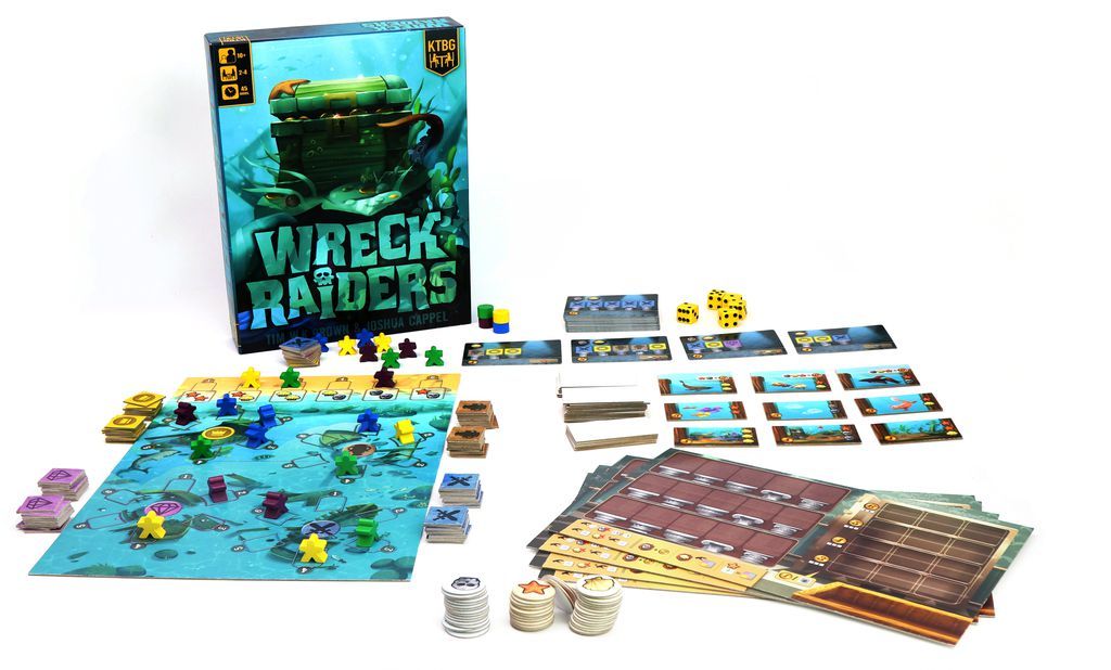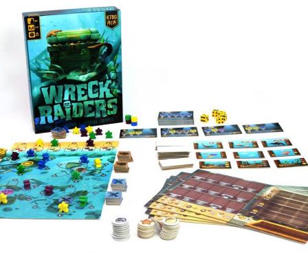Wreck Raiders is an innovative dice-drafting worker placement system. Choose a die from the pool, then send one of your divers to any spot on the board with that number. But be warned: the spot you choose will help any diver in the spots next to you, whether they’re friendly or not. Will you risk letting a rival in on your haul to get that treasure you want, or can you find a way to grab yourself some extra loot?