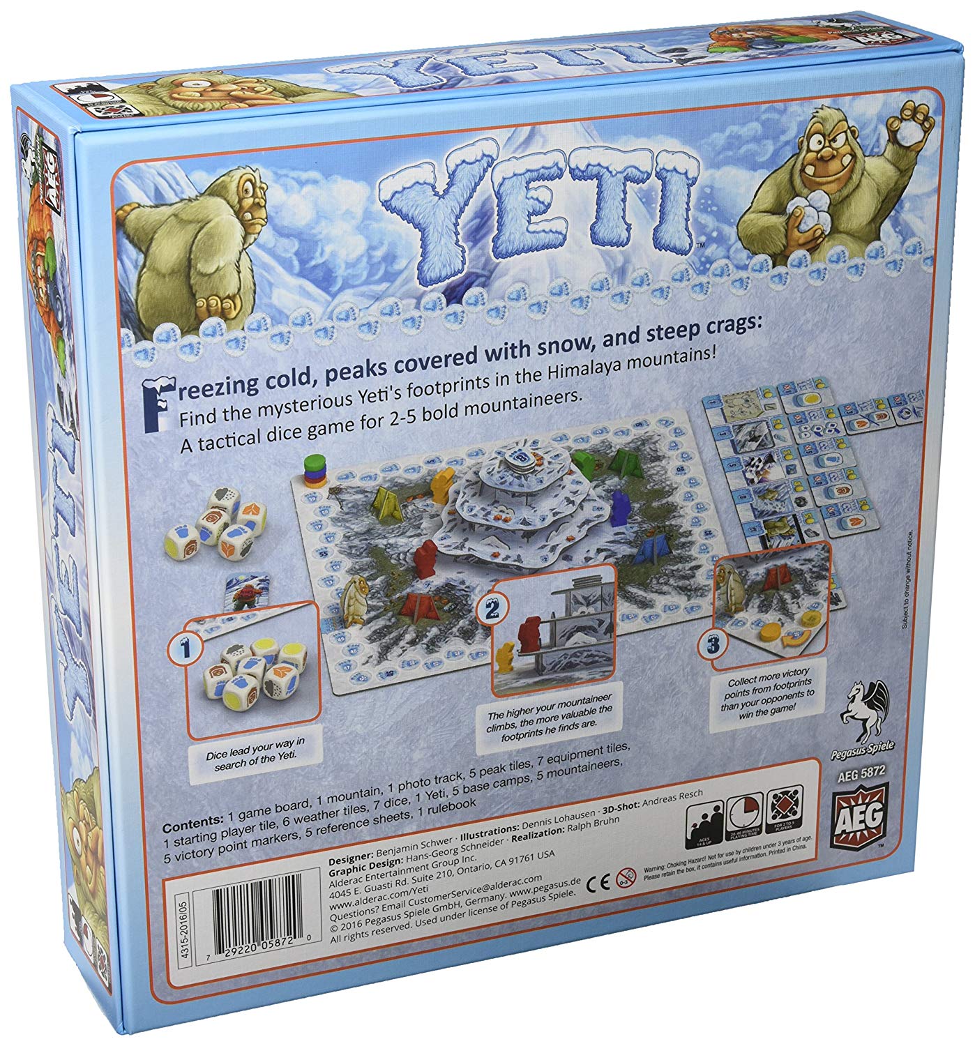 In Yeti players are competing adventurers and mountaineers, looking for traces of the Yeti, the legendary Snowman in the Himalaya. They want to find its footprints — or even better take photos of it — in order to collect points. To achieve this, they need to improve their equipment and acquire the help of Sherpas to lead them up the mountains. Most importantly, though, they should hope for good weather because if too much snow falls, the search of all players comes to a halt...