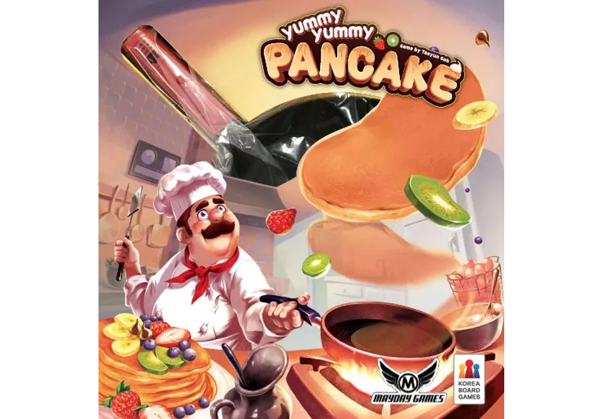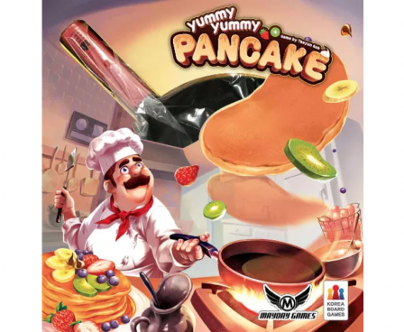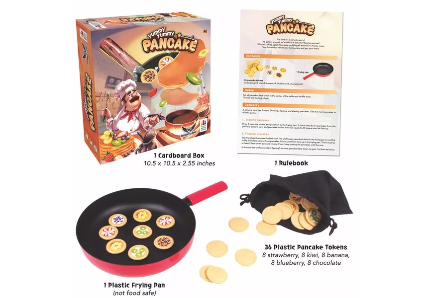 On a turn, a player lays out eight face-up tokens in a frying pan, and all other players get to see the toppings on these pancakes. Then the active player attempts to flip as many pancakes as possible. (If they fail to flip more than two, the player can try again. If any pancakes leave the pan, they're returned to the pan face up.)