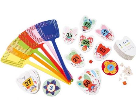6 fly swatters, 42 fly cards, 5 flower cards, 5 flowers, 45 wooden flies, 2 numerical dice with ten faces, Set of game instructions.