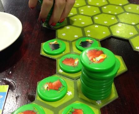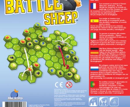 In Battle Sheep (first released as Splits), players start the game by constructing the board from identical four-hex tiles, then each player places his/her tall stack of discs on one of the border hexes. Players take turns removing some number of discs from the top of one of their stacks, moving that new stack of discs as far away as it can go in a straight line. Players must leave at least one disc behind when moving, so the board gradually fills up and movement opportunities become more and more scarce. The player occupying the most spaces at the end of the game wins!