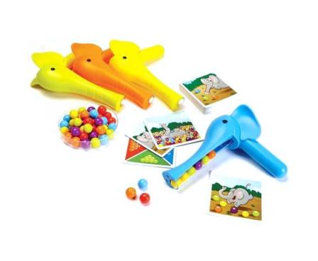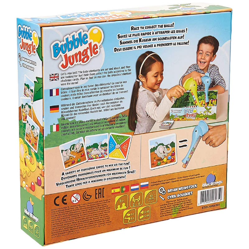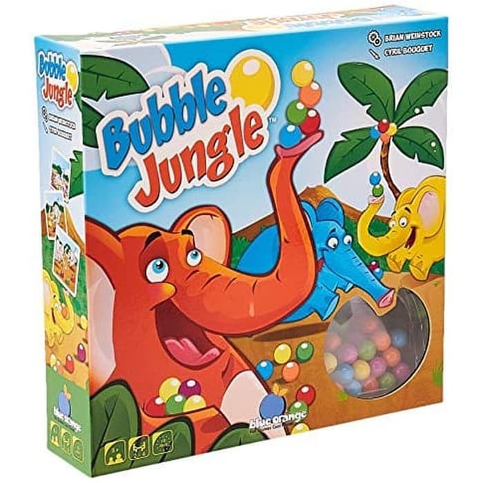 In Bubble Jungle, a.k.a. Tricky Trunks, each player has a plastic elephant device that includes a long tube through which the player can pick up colored balls that are mixed in a box at the start of play. The game includes 48 balls, eight each in six colors.