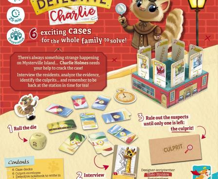 Détective Charlie is a co-operative deduction game. When it is your turn, roll the die and move Detective Charlie to interview witnesses. As witnesses help you rule out suspects, you will soon find out that the last suspect may be the culprit!