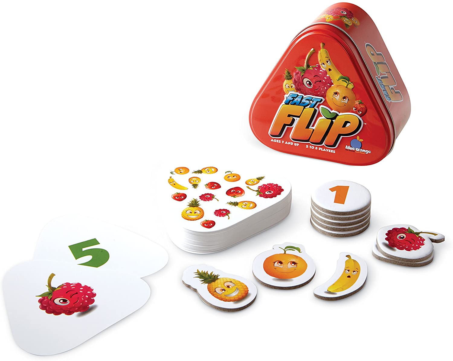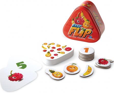 Alternatively, you can play with five fruit tokens and five number tokens. When you yell out an answer correctly, you claim the token that shows that answer, whether from the center of the table or from another player. Whoever first has five tokens in front of them wins.