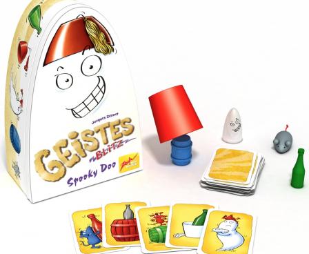 Geistesblitz Spooky Doo is the latest addition to Zochs brain twister family of games. It comes in a beautiful metal box and features two new items, the barrel and the fez. While the basic Geistesblitz rules still apply, the fez can be placed over any of the other items. It is a new challenge to know which item is hidden underneath the fez at all times.