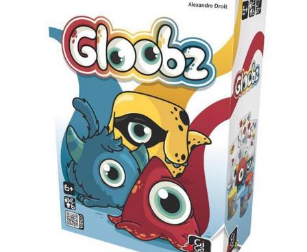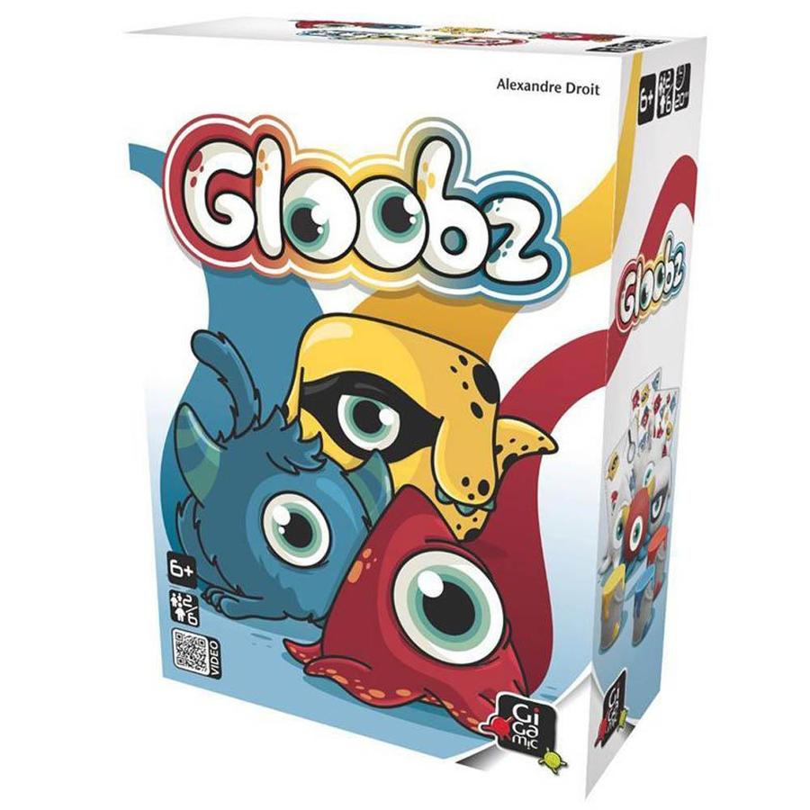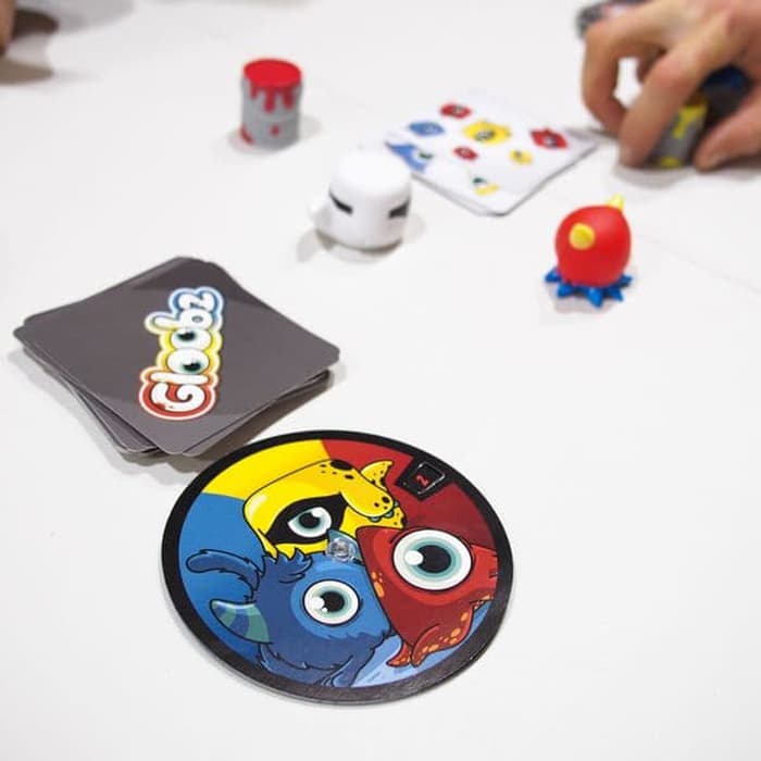 Seven plastic items start in the middle of play: three paint cans (blue, red, yellow), three critters (triangular, square, round) and one boss gloob that is all colors and shapes. On a turn, a player calls either "more" or "less", then flips the top card of the deck. Depending on what's called, players race to grab the items that correspond to the color and shape most (or least) visible on the card, scoring one point for each item correctly grabbed. If a magnifying glass appears on the card, players can grab anything they want. If the boss shows up, just grab him and score three points if you do.
