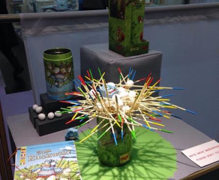 On your turn in Go Cuckoo/Zum Kuckuck!, you take one standing stick and put it on the nest. If both ends of the stick have the same color, you may choose to lay an egg on it. Otherwise, you take another stick whose top color is the same as the hiding color of the previous one, up to three sticks. After laying an egg or putting the third stick with different colors, your turn ends. There are penalties for a stick touching the ground or eggs falling from the nest.