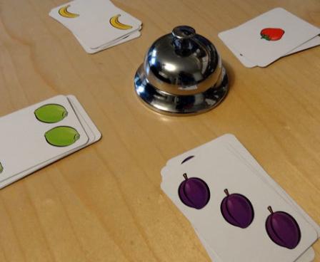 The deck is distributed evenly between the players. All players hold their deck face down and take turns dealing one card face up in front of them. As each player reveals her next card, the instant you see a total of five of one kind of fruit on the table, hit the bell. If you're correct, you pick up all the played cards and put them into your deck; if you're wrong, you pay the other players one card each. When you run out of cards, you're out. When two players are left, they play until the bell is struck once more, then the game ends and the taller deck wins.