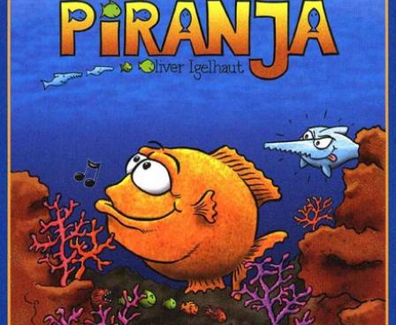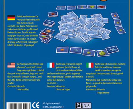 This card game from Oliver Igelhaut has fish feeding on fish. The cards show different types of fish in different sizes, from hungry to full. Players draw cards and play them to rows, with hungry fish eating everything in front of it until it meets a like fish. A fish doesn't eat its like, and instead goes to the table as a fat fish. When a player has drawn 3 cards of a kind, it can take a fat fish from the table. When the round ends, players score for the most fish in their catch.