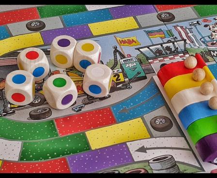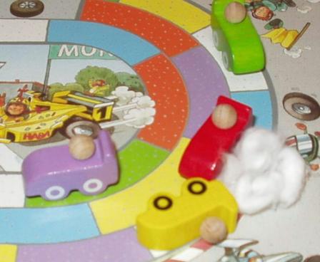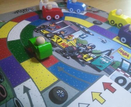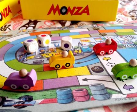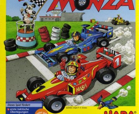 Monza is a car race game for children. Players roll six dice on their turn, and move their car according to the colors shown on the dice. The dice are identical, each having six different colors, one on each side. The board is a three-lane race track. Monza encourages tactical thinking as well as color recognition. The game states it is for children 5 and older, but 3-4 year olds can join in the fun as well.