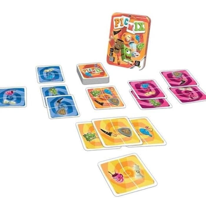 In Picmix, each player has a set of four cards on which are shown sixteen items. Each turn, a goal card with three or four of these objects is revealed. Be the fastest to position your cards in such a way that only the objects appearing on the target card are visible. Keep your cool to find the right combination first.