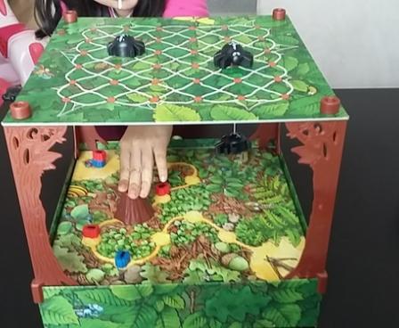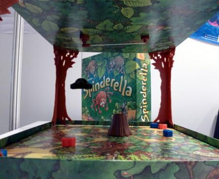 In Spinderella, players race to get their three ants across the forest floor as quickly as they can, but spiders await in the branches above and with a little help from opponents one might swoop down to scoop up your ant and return it to the starting line. You can do the same to them, of course, so search for the right time to act and the right places to hide.
