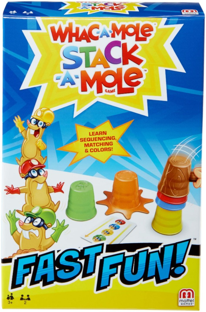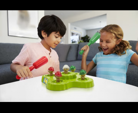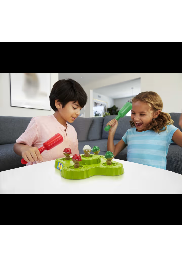The Whac-a-Mole™ kids game is a silly, whacky, bopping blast with lights and delightful sounds that can be played alone or with a friend! The goal is simple -- bop the moles that light up! For a 1-player game, hit the moles that light up on the whole arcade unit. Keep an eye on the middle mole because it's wild and worth bonus points! When time is up, the unit will reveal your score. Keep playing to get higher scores. For a 2-player game, each player watches for only their moles to light up, and if the middle mole lights up in their color, smack it! When time is up, the unit will reveal the winner.