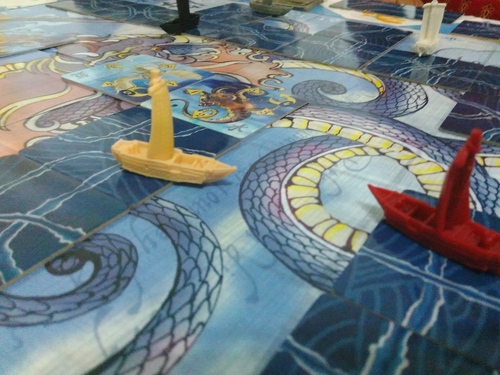 If a daikaiju tile hits a wake tile, a ship, or another daikaiju tile, the object hit is removed from the game. Another way to be ousted! The more daikaiju tiles on the game board, the faster players will find themselves trying to breathe water...