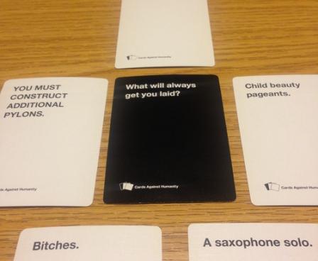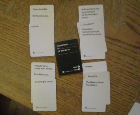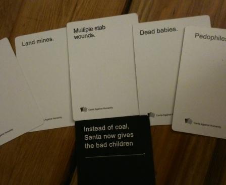 This, so far, sounds like the popular and fairly inoffensive Apples to Apples. While the games are similar, the sense of humor required is very different. The game encourages players to poke fun at practically every awkward or taboo subject including race, religion, gender, poverty, torture, alcoholism, drugs, sex (oh yes), abortion, child abuse, celebrities, and those everyday little annoyances like "Expecting a burp and vomiting on the floor".