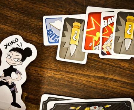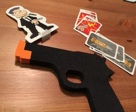 Each round, one player is the Boss, and he controls the pace of play. First, loot cards are revealed on the table to show what's up for grabs. Next, players load their guns by secretly selecting either a "Bang!" or a "Click! Click!" card from their hand. The Boss counts to three, and on "Three" each player points his foam gun at someone else; due to his status, the Boss can tell one player who's pointing a gun at him that he needs to point it in another direction. After a pause to observe threats and measure the seriousness in an opponent's eyes, the Boss counts to three again and anyone who doesn't want to risk getting shot can chicken out and remove themselves from the round.