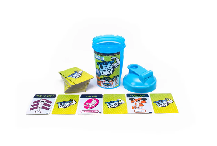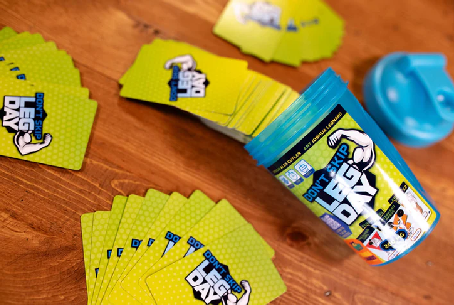 Don't Skip Leg Day is a competitive game for 3-6 players, although you can add sets to increase the player count. The game is played over two rounds (weeks) consisting of seven turns (days). Each turn, all players select one card from their hand to keep, then pass the rest of their hand to another player. Players repeat this action (keeping a card and passing the ones they don't want) until all players have chosen seven cards. Some of the cards you choose to keep will be made public to all players, but many will remain a secret until the end of the game.