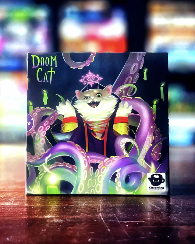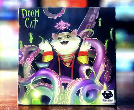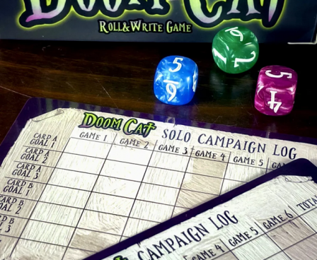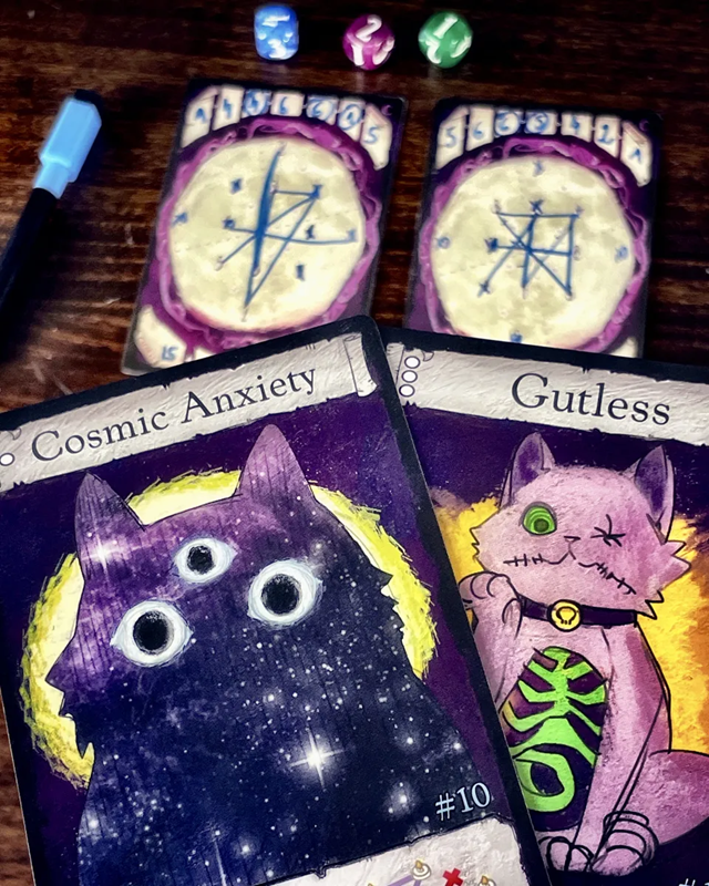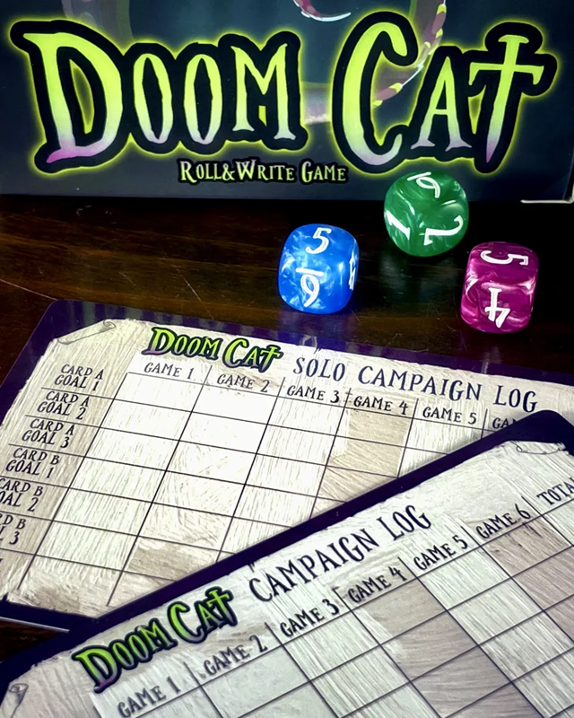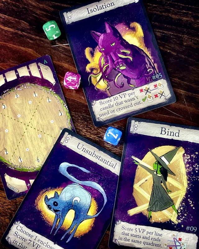 In Doom Cat, you must learn how to draw sigils. You start with 2 magic circle pages filled with numbered candles. Roll 3 dice and draw a line between 2 of the candles matching two of the dice. The cat steals the other die and knocks over a matching candle, making it unusable in future rounds. The game ends after 14 rounds. Highest score wins. Solo players must score 70 or more points per sigil card to win.