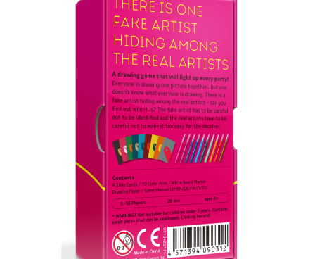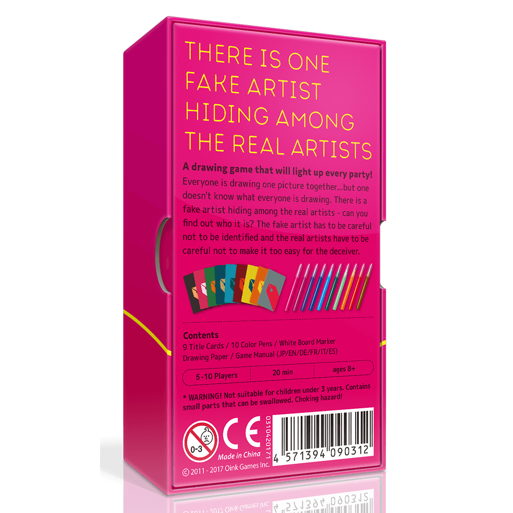 Players will then go around the table twice, drawing one contiguous stroke each on a paper to draw the word established by the Question Master, then guess who the fake artist is. If the fake artist is not caught, both the fake artist and the Question Master earn points; if the fake artist is caught and cannot guess what the word is, the artists earn points.