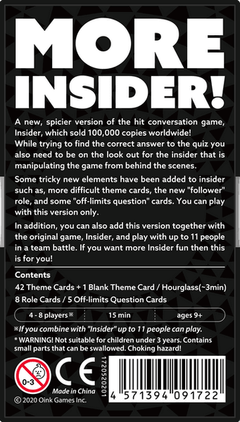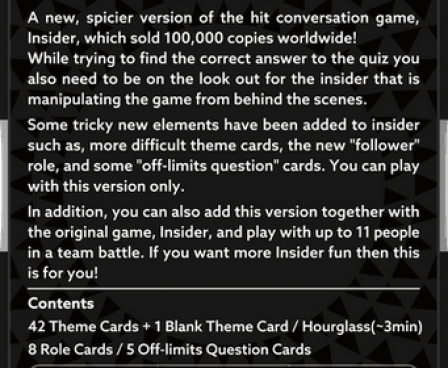 A new, spicier version of the hit conversation game, Insider, which sold 100,000 copies worldwide! While trying to find the correct answer to the quiz you also need to be on the look out for the insider that is manipulating the game from behind the scenes. Some tricky new elements have been added to insider such as, more difficult theme cards, the new "follower" role, and some "off-limits question" cards. You can play with this version only. In addition, you can also add this version together with the original game, Insider, and play with up to 11 people in a team battle. If you want more Insider fun then this is for you!