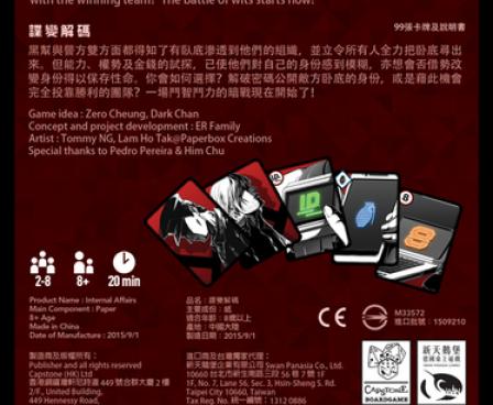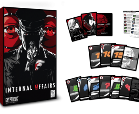Internal Affairs is an intense elimination game between infiltrators from both the Triad and the Police Force Infiltrator. Each player has a set of secret ID cards which determine that player's allegiance. Each player also has a secret code, which when cracked reveals the player's real ID. At the beginning of the game, each player has five code cards and chooses three of them to be the secret code that locks the identity file. During their turn, players try to crack other players' codes to find out who is who and get their team to victory. Due to action cards, though, ID cards may be passed from player to player and this may change each player's allegiance. Players must be quick to win, as otherwise they may end up in the losing team when they least expect it.