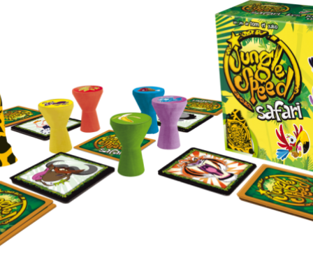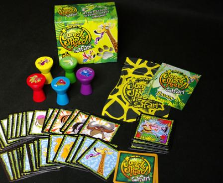 Jungle Speed Safari is a standalone game that's part of the Jungle Speed family. The core gameplay is the same, with players turning over cards from their personal stacks one by one in front of themselves and reacting when certain cards or combinations of cards appear, but Jungle Speed Safari features five wooden totems to grab instead of one, and you interact with them in different ways, with every card that's revealed possibly triggering an action. If a player reveals a hungry animal card, for example, all players must race to grab the appropriate totem to satisfy the animal. Whoever grabs that totem adds the hungry animal card to his score pile.