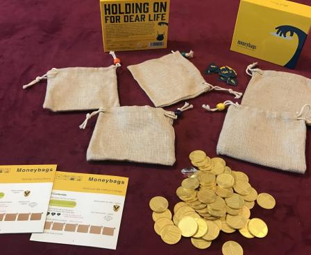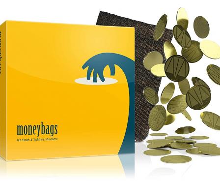 In ふくろと金貨 (Moneybags), players try to have the most gold coins, with each player having their own bag filled with some number of brass coins. If you think you have the most coins, you might want to exit the round to keep them as others will try to transfer coins from your bag to theirs!