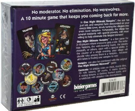 One Night Ultimate Vampire is a fast game for 3-10 players in which everyone gets a role: The nefarious Vampire, the well-meaning Cupid, the sneaky Assassin, or others, each with a special ability. In the course of a single evening, your village will decide who among them is a vampire...because all it takes is finding one vampire to win!