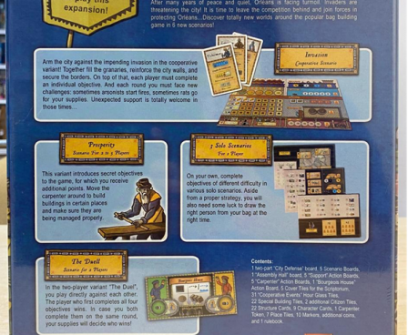 Orlans: Invasion, the first large expansion for the award-winning game "Orlans", contains six scenarios, new buildings, and several new event-cards. The scenarios were designed by Reiner Stockhausen and Inka & Markus Brand: