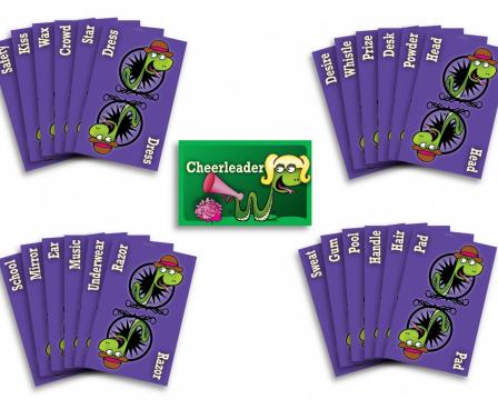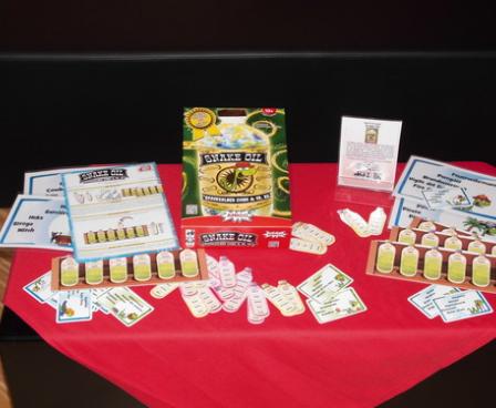 To set up Snake Oil, each player takes six purple word cards. The customer for the round draws a customer card and announces it. Inventors quickly combine two purple word cards from their hand to form a crazy new product to sell to that customer. When ready, each inventor quickly pitches his or her product directly to the customer. The customer can end any pitch that goes longer than thirty seconds. The customer decides which product to buy and gives the inventor of that product the round's customer card as the prize. Inventors discard all used word cards and take two new word cards each. The player to the left of the customer becomes the next round's customer. Play repeats until each player has been the customer once.