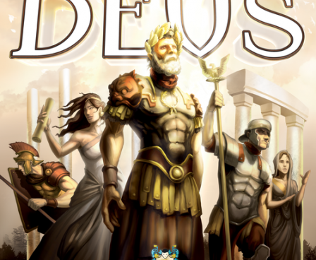 In Deus, players work to develop their own civilizations in a shared environment. Each player starts the game with five building cards, and on a turn a player either uses one of these cards to construct a building or discard one or more cards to make an offering to a god. Cards come in six colors: red for military, green for resource production, blue for trade, brown for scoring, purple for temples, and yellow for a variety of effects.
