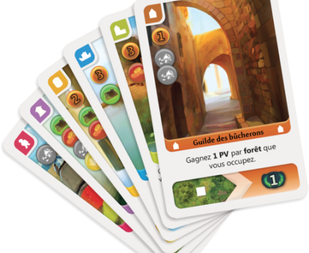 When you construct a building, you build it in the appropriate location on the modular game board which is sized based on the number of players with the hexagonal tiles composed of seven landscape "circles" then you place the card in your personal tableau in the appropriate stack of colored cards and activate the power of all of those cards already in your tableau, starting with the card at the bottom of the stack.