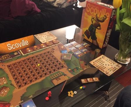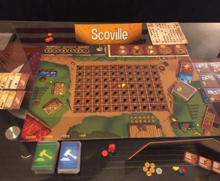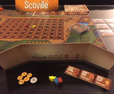 A round of Scoville consists of a blind auction, which determines player order, a planting phase, a harvesting phase, and a fulfillment phase. Each round, the players plant peppers in the fields. Throughout the game, the available opportunities for crossbreeding increase as more peppers are planted. When harvesting, players move their pawn through the fields, and whenever they move between two planted fields, they harvest peppers. If, for example, they harvest between fields of red and yellow peppers, they crossbreed those and harvest an orange pepper. Harvested peppers are then used to fulfill the town's peppery desires!