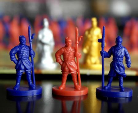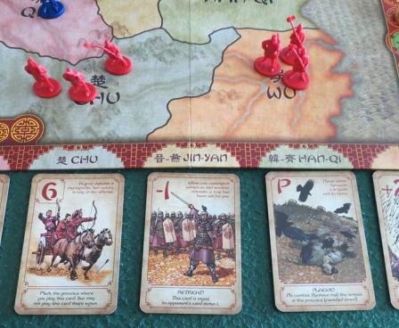 In Sun Tzu, a.k.a. Dynasties, players take on the role of Sun Tzu or King Shao, leading these two opposing armies in an attempt to unify China through the deployment of their armies and forces rather than by brute force. Each turn players play cards to specific provinces, then reveal them individually by province. Armies are added or removed from the province depending on who played the higher valued card or who played a special card. Some cards can only be used once, so playing the card at the correct time is critical to a winning strategy. The game has a feel of "tug-of-war" as the scoring marker starts in the middle of the scoring scale and the players attempt to move the marker to their side of the track. The game ends after nine rounds or if either player is able to move the scoring marker to the last space on his side of the scoring track.