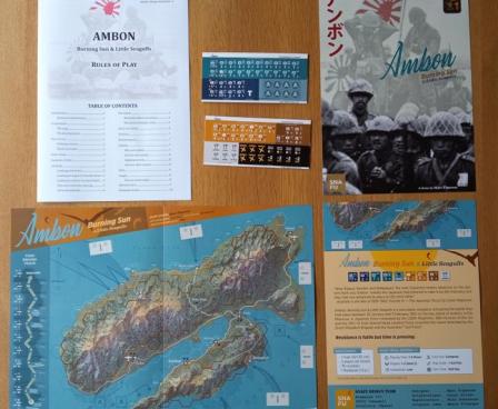 "Ambon: Burning Sun & Little Seagulls" is a two player wargame simulating the battle of Ambon, that took place between 30th January and 3rd February 1942 in the island of Ambon, in the Moluccas. A Japanese force composed of the 228th Regiment of the 38th Division of the IJA and the 1st Kure Special Naval Landing Force occupied the island against a force composed of the Dutch Molukken Brigade and the Australian "Gull Force".