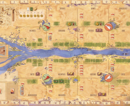 Each player wants, as pharaoh, to build the most pyramids. To accomplish this, he must first acquire a province, where he can trade and farm. With his profits, he can buy new provinces and building stones to erect pyramids. For all his actions, the player must make clever use of his power cards, and always offer appropriate sacrifices to Amun Re. Players must always keep their eyes on the goal of the building of the eternal pyramids or risk falling behind in points.