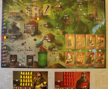 Architects of the West Kingdom is set at the end of the Carolingian Empire, circa 850 AD. As royal architects, players compete to impress their King and maintain their noble status by constructing various landmarks throughout his newly appointed domain. Players need to collect raw materials, hire apprentices, and keep a watchful eye on their workforce. These are treacherous times, and rival architects will stop at nothing to slow your progress. Will you remain virtuous, or be found in the company of thieves and black marketeers?