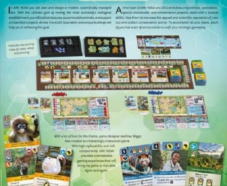 In Ark Nova, you will plan and design a modern, scientifically managed zoo. With the ultimate goal of owning the most successful zoological establishment, you will build enclosures, accommodate animals, and support conservation projects all over the world. Specialists and unique buildings will help you in achieving this goal.