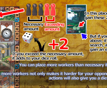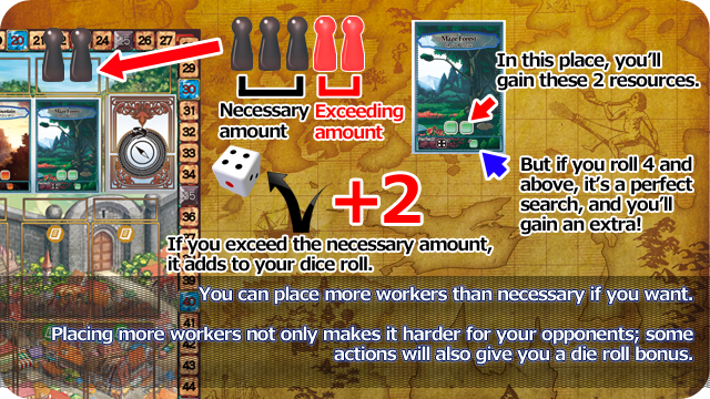 The game lasts four rounds, with each round representing a year. Each round, players take turns placing one or more of their workers on one action they want to do: gather resources, take up an order, employ an assistant, or transmute at the alchemy forges. The trick is that the more workers on one spot, the less effective an action becomes; if you want to place workers on a spot where there are already some, you'll have to exceed the number of workers already there.