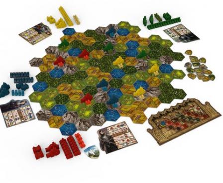 At the beginning of the game, players create the board at random with nine tiles per player; each tile is comprised of three hexagons, with each hexagon being one of five landscape types: forest, plains, field, mountain, lake. Players then each place three cities on the game board, with a knight in each city. They then take turns in clockwise order, with each player taking exactly one action from the six possible actions.