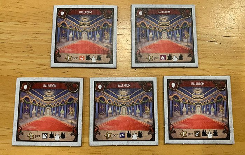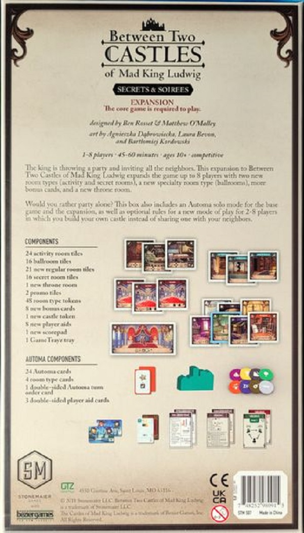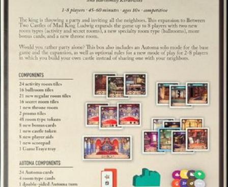 The king is throwing a party and inviting all the neighbors! This expansion to Between Two Castles of Mad King Ludwig expands the game up to 8 players with two new room types (activity and secret rooms), a new specialty room type (ballrooms), more bonus cards, and a new throne room.